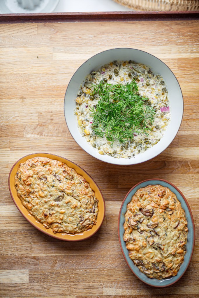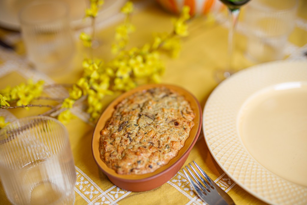 6) Bake the pâté in a greased baking pan at 200°C for 35-40 minutes. Serve with leftover mushrooms or pickled beetroot.