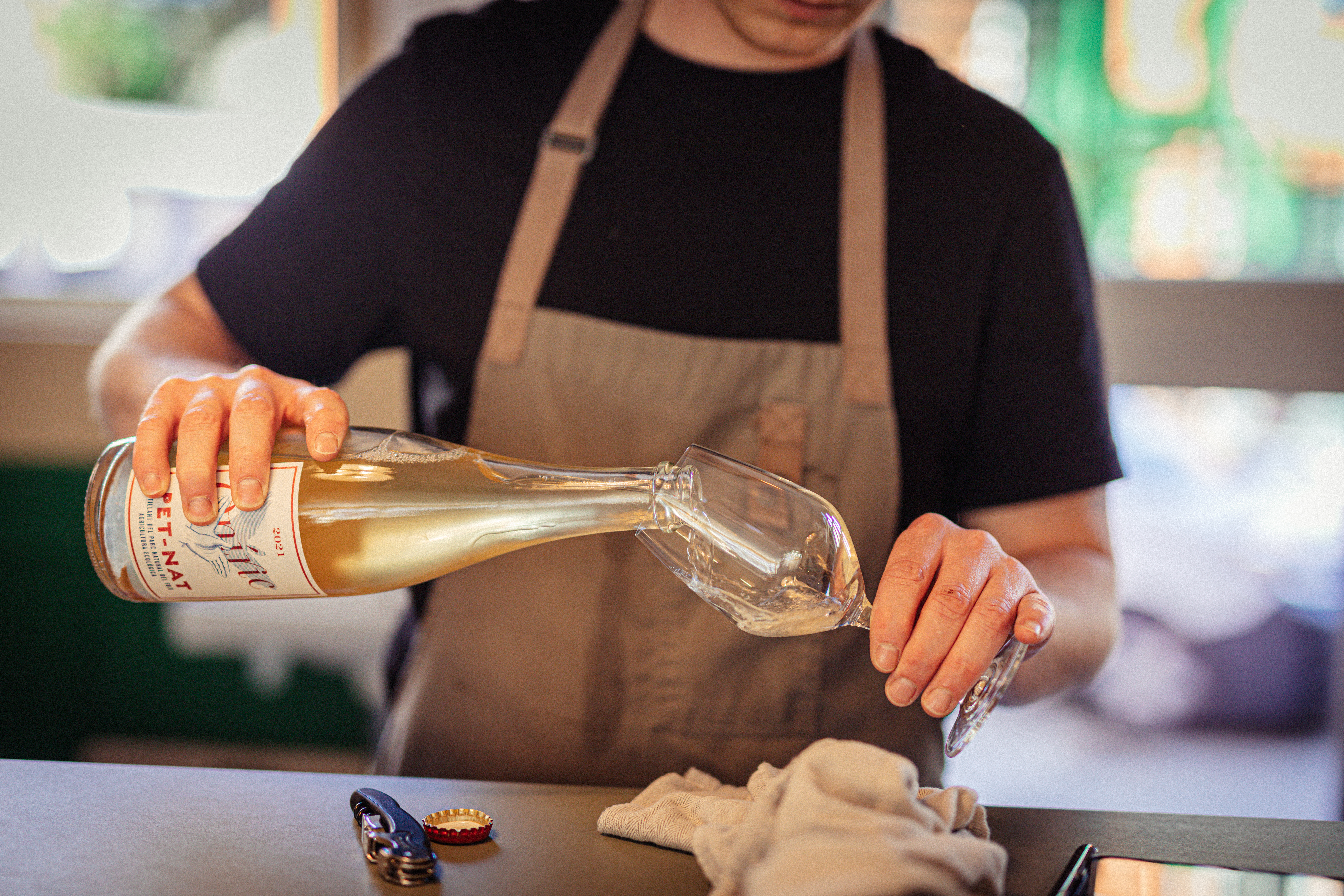 Well, what better way to understand it, than drinking it? Som is pouring us a couple of glasses while explaining what he believes to be a good bottle of natural wine. “In general, I prefer something light whether it’s natural or conventional. It can’t have too many flaws, and if it has any, they should be controlled.” From Møf’s wine list Som recommends Claus Preisinger: a crisp, fresh and minimalistic Austrian white perfect for a warm summer evening on the balcony. A smooth example of a natural wine, which is great if you aren’t used to or too happy about notes off the spectrum. The bottle is a mix between grapes such as Grüner Veltliner, Welschriesling and Weißburgunder.