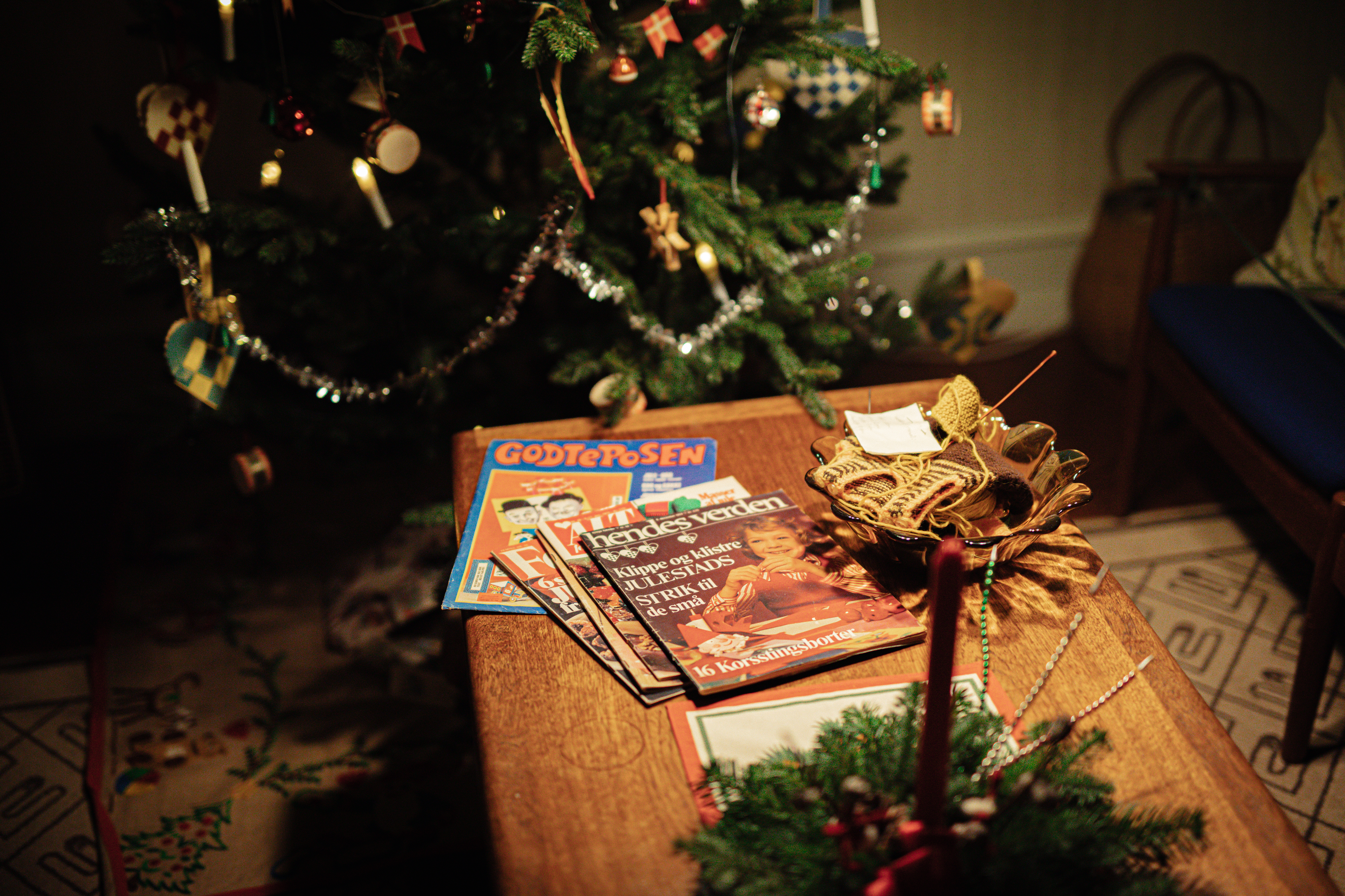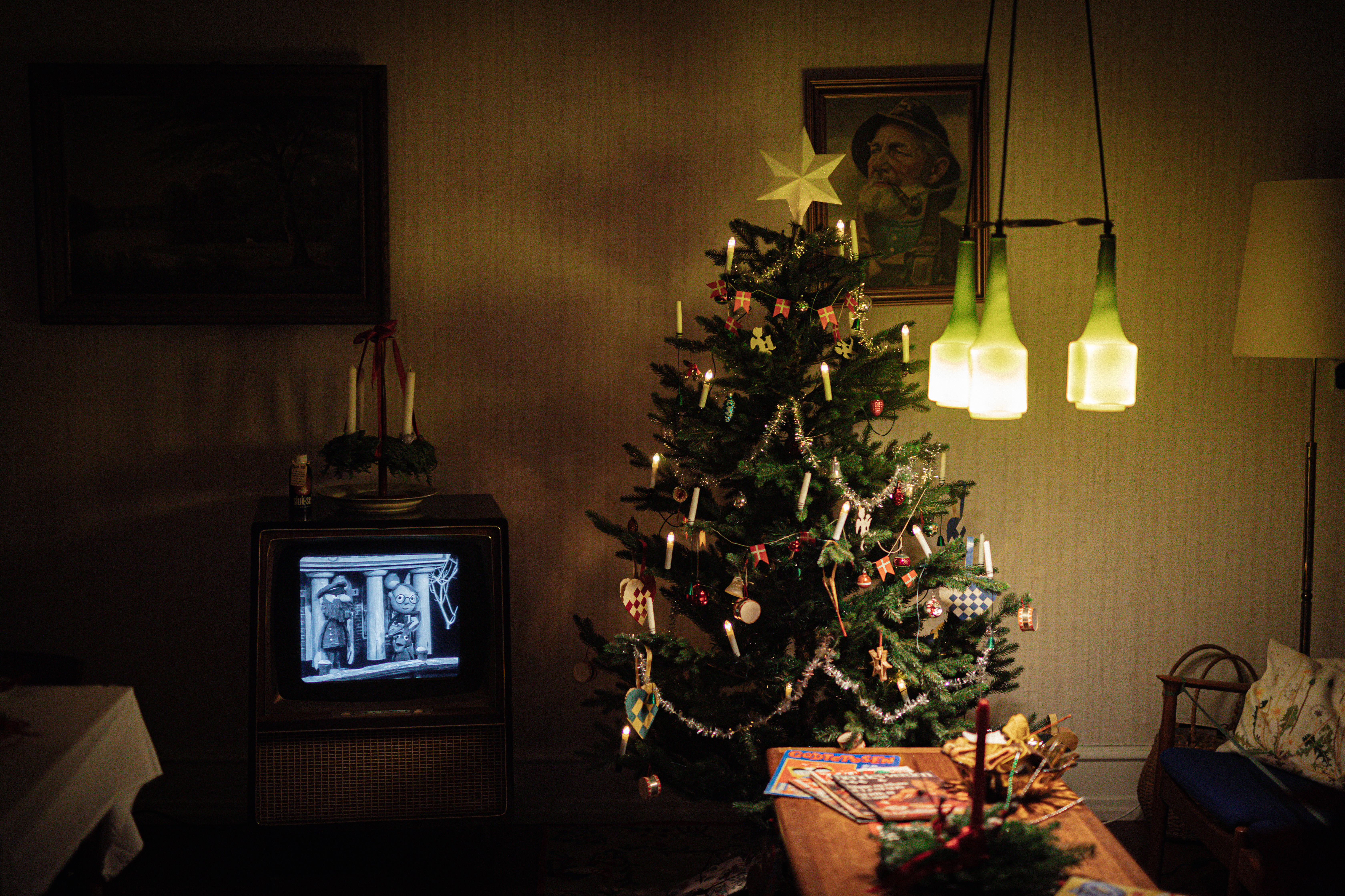 However, in 1974 Christmas has developed into the Christmas we know today. “Typical for Danish people it’s hard for us to wait. The 12 days of Christmas from Christmas Eve to Epiphany of 1864 has changed into 24 days of Christmas – from December 1st till the 24th. Christmas calendar shows and calendar lights help count down for Christmas.” Birgitte move us through the rooms of a small apartment into the living room. The TV is showing the calendar show of 1974: Jullerup Færgeby and the Christmas tree is decorated with both real candles and electric lights. “Electric lights made its way to the tree, but most people still placed real candles on the tree to be lit on Christmas Eve.” The lights are still a very important part of Christmas even though modern life has almost extinguished natural darkness. Much like today.